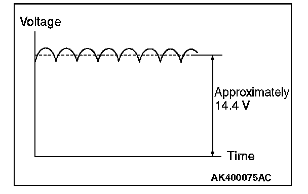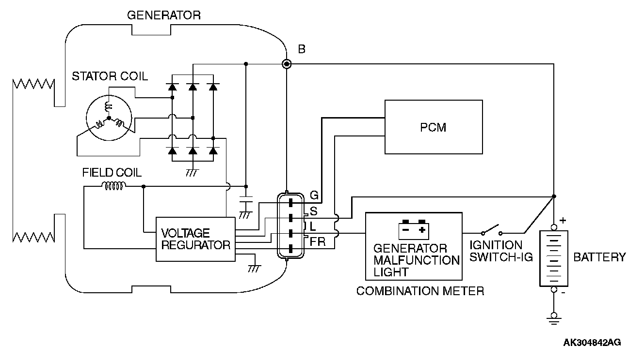 When the battery positive voltage (generator S terminal voltage) reaches a regulated voltage of approximately 14.4 V, the field current is cut off. When the battery positive voltage drops below the regulated voltage, the voltage regulator regulates the output voltage to a constant level by controlling the field current.