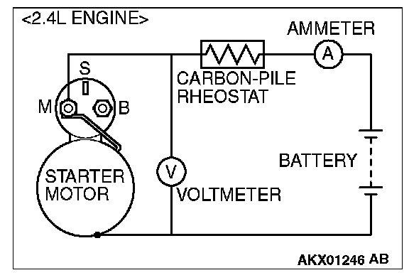2. Connect a test ammeter (100-ampere scale) and carbon pile rheostat in series between the positive battery terminal and starter motor terminal.