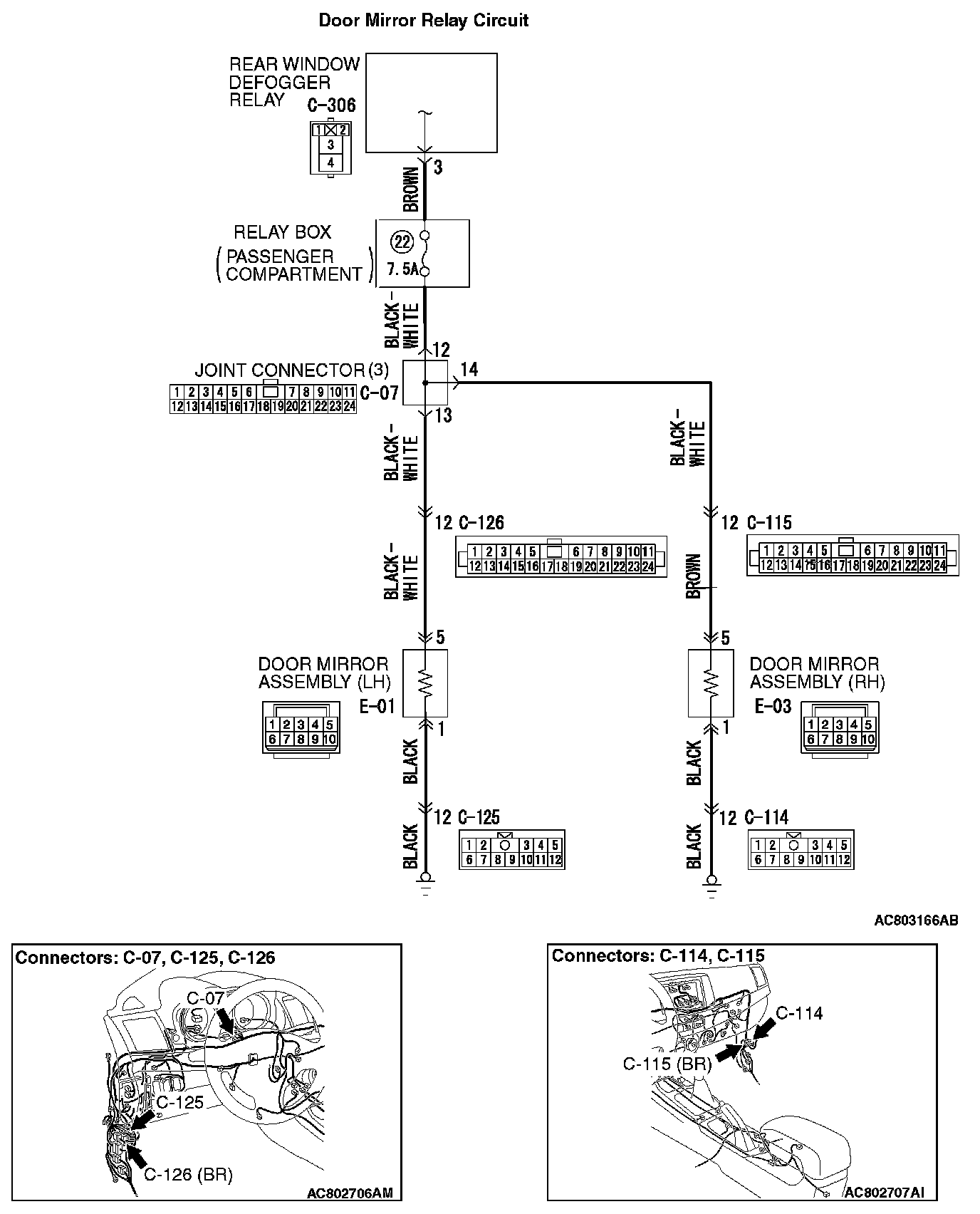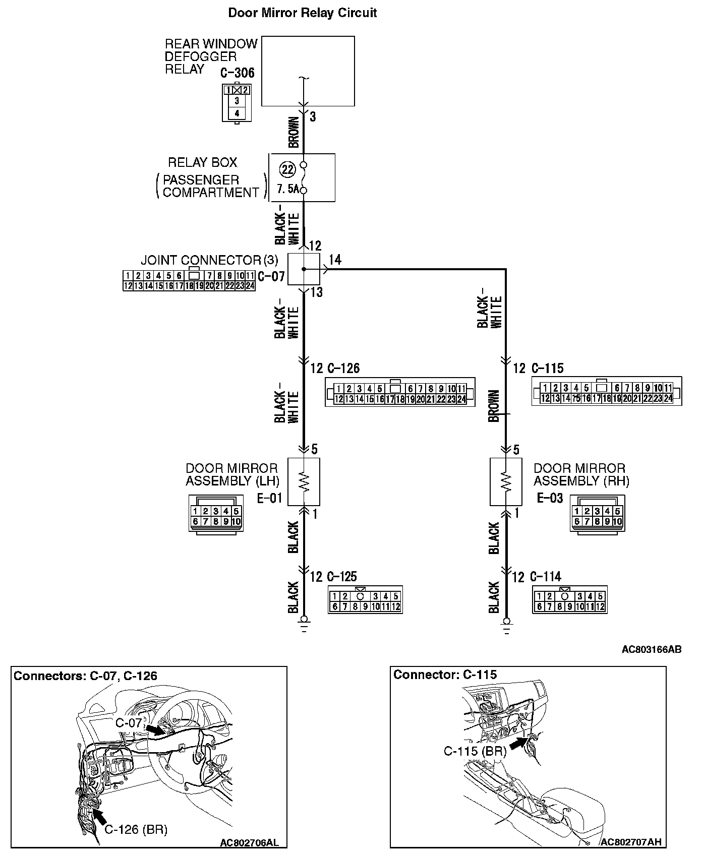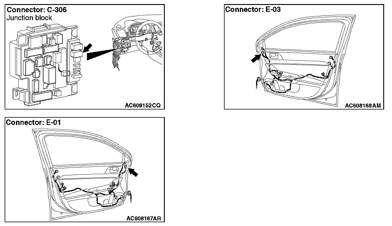 STEP 7. Check the wiring harness between door mirror (LH) connector E-01 (terminal 5) and rear window defogger relay connector C-306 (terminal 3).