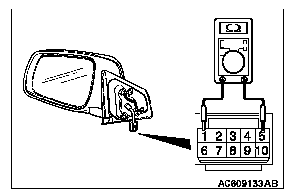 Check to see that the resistance between terminal 1 and 5 of the door mirror (RH) connector E-03.