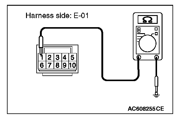 STEP 4. Check the ground circuit between door mirror (LH) connector E-01 and ground for open circuit. Measure the resistance at door mirror (LH) connector E-01.