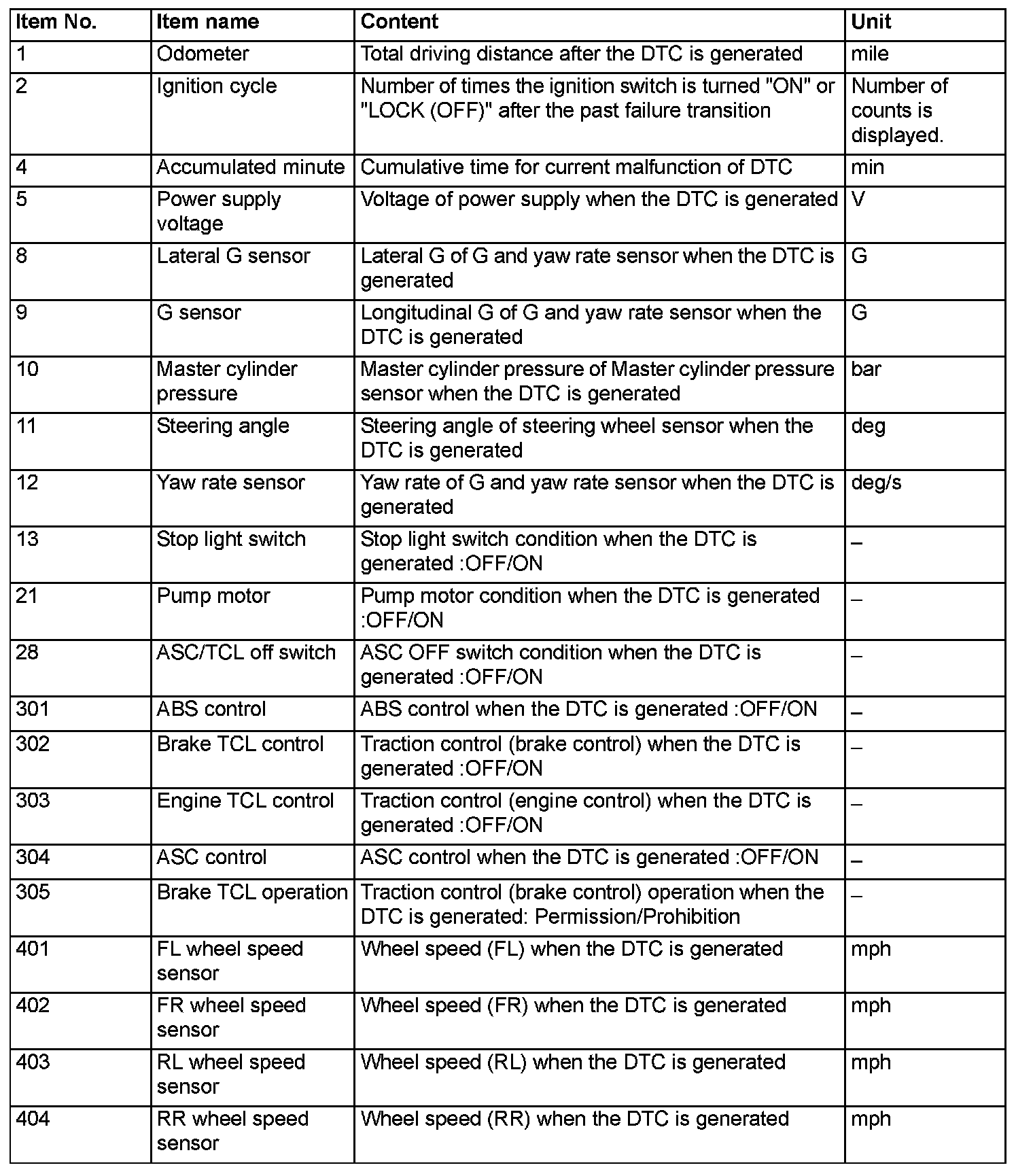 When detecting fault and storing the DTC, the ECU connected to CAN bus line obtains the data before the determination of the DTC and the data when the DTC is determined, and then stores the ECU status of that time. By analyzing each data from scan tool, the troubleshooting can be performed more efficiently. The displayed items are as the table below.