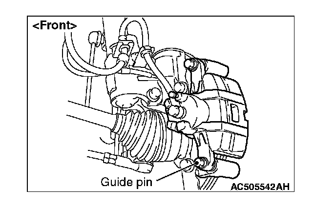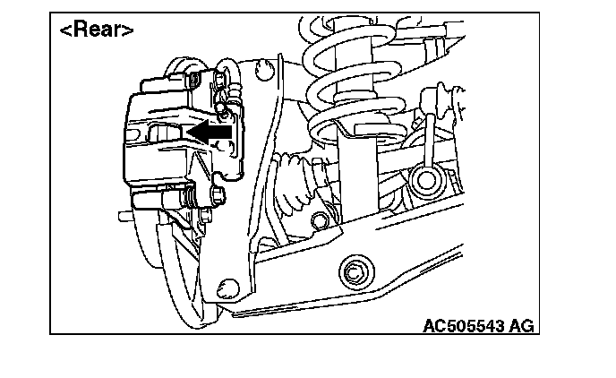 1. Remove the parts indicated in the figure, swivel the caliper body upward and retain it with a wire or similar tool.
