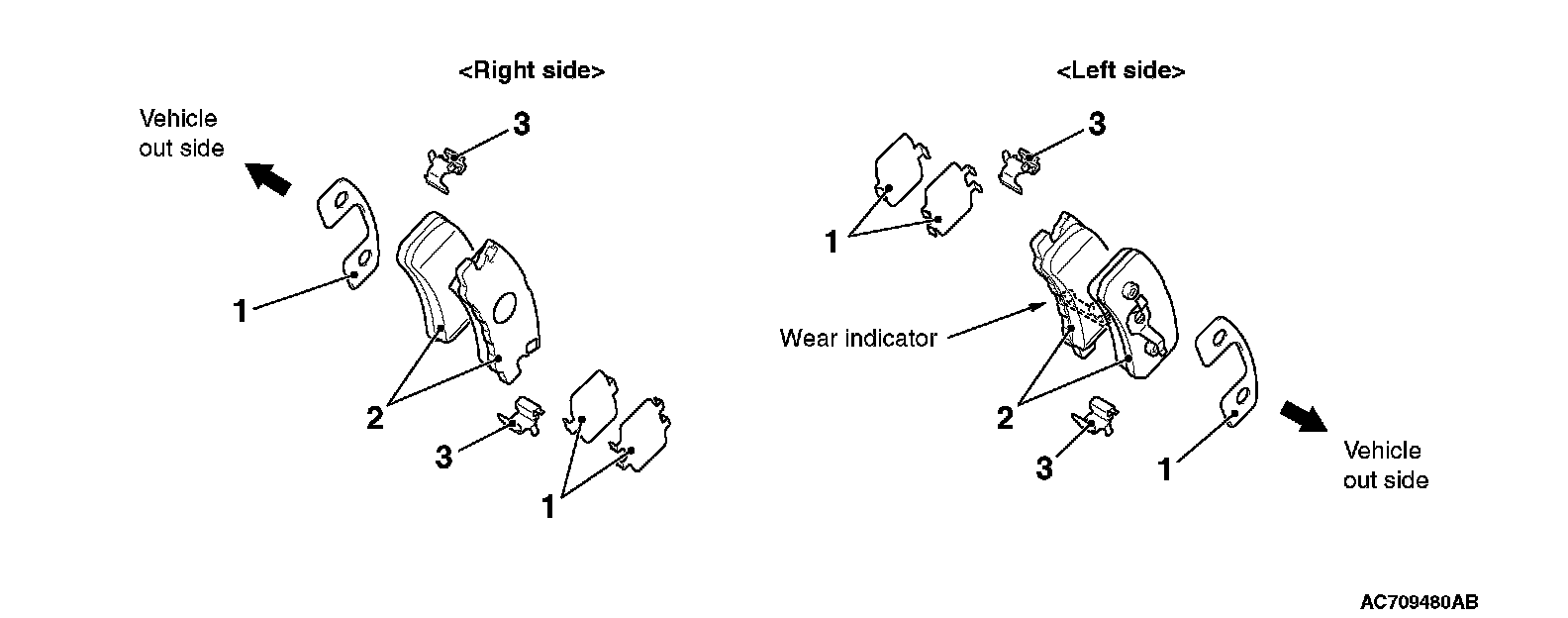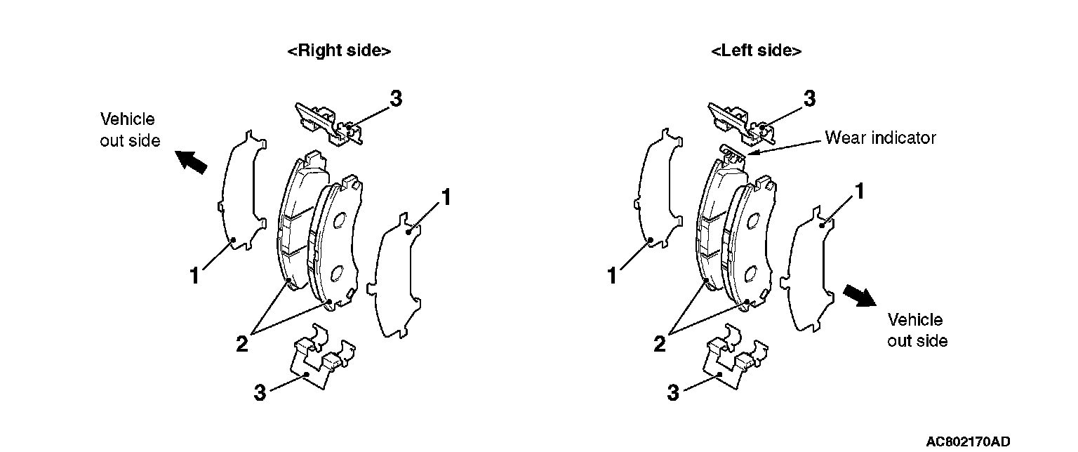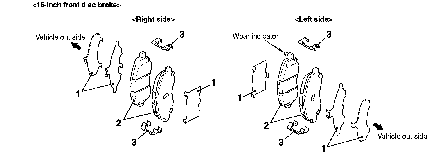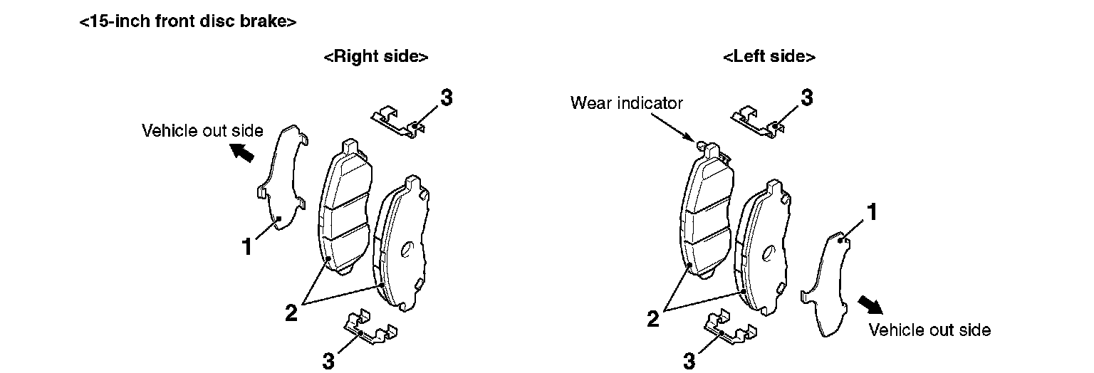 ^ The brake pad assembly with wear indicator is installed only to the inner side of the brake disc of the left-side brake at factory.