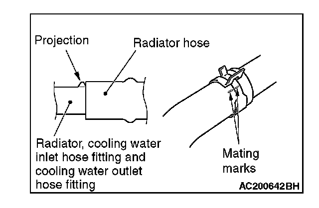 1. Insert radiator hose as far as the projection of the cooling water inlet hose fitting, cooling water outlet hose fitting or radiator.