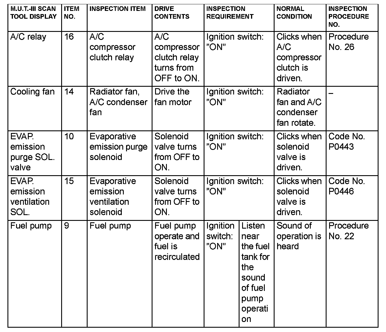 Actuator Test Reference Table (Part 2):