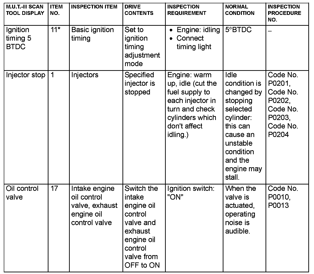 Actuator Test Reference Table