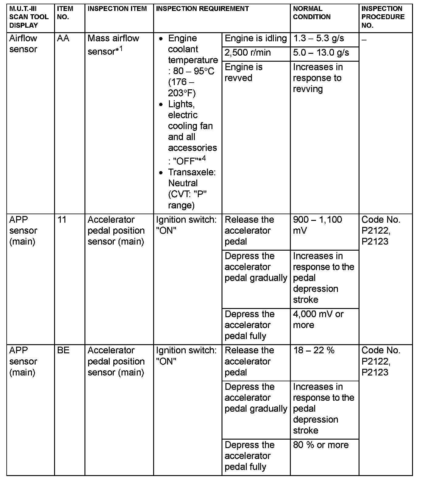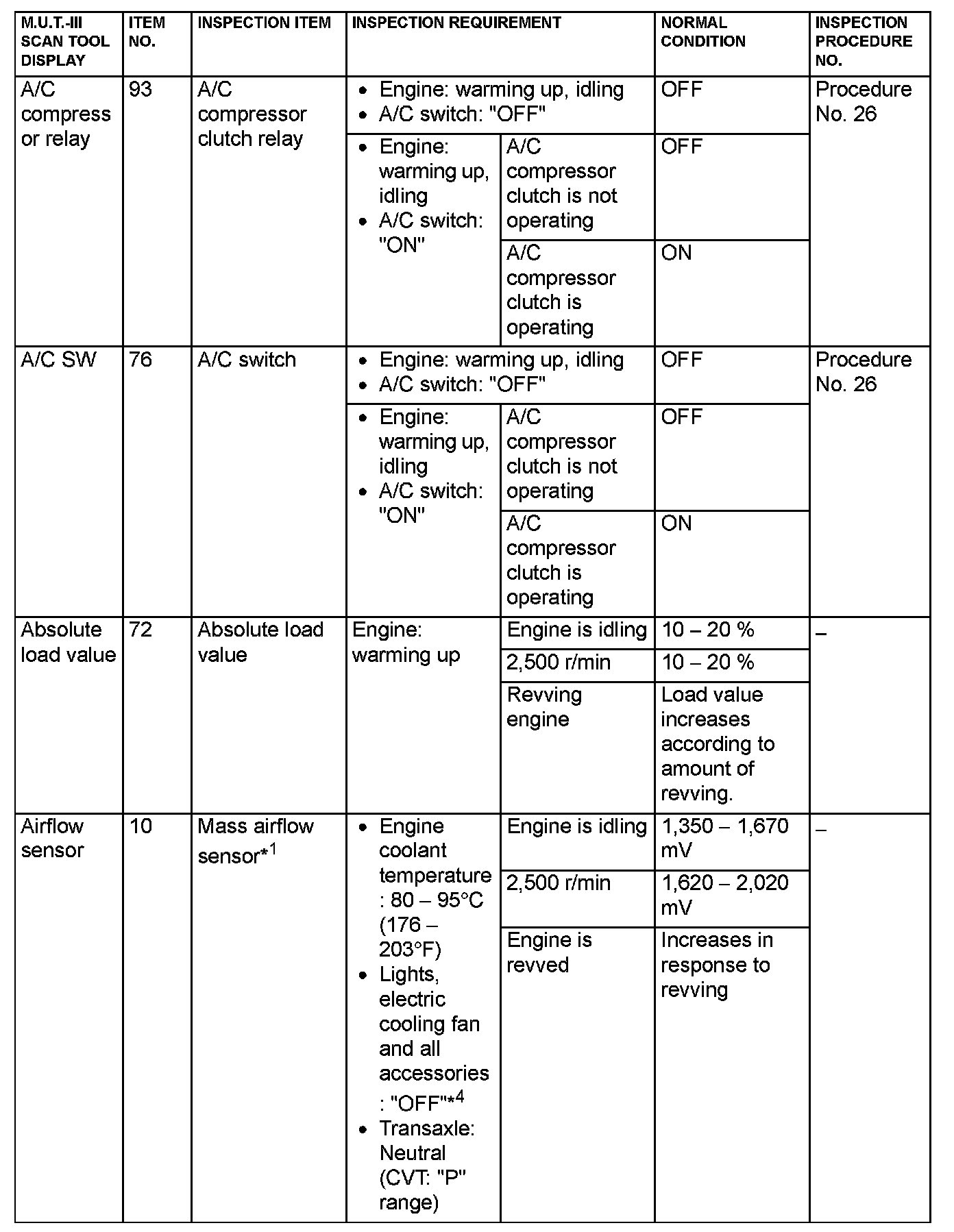 *1 : In a new vehicle [driven approximately 500 km (311 mile) or less], the mass airflow sensor output value is sometimes 10% higher than the standard value.
