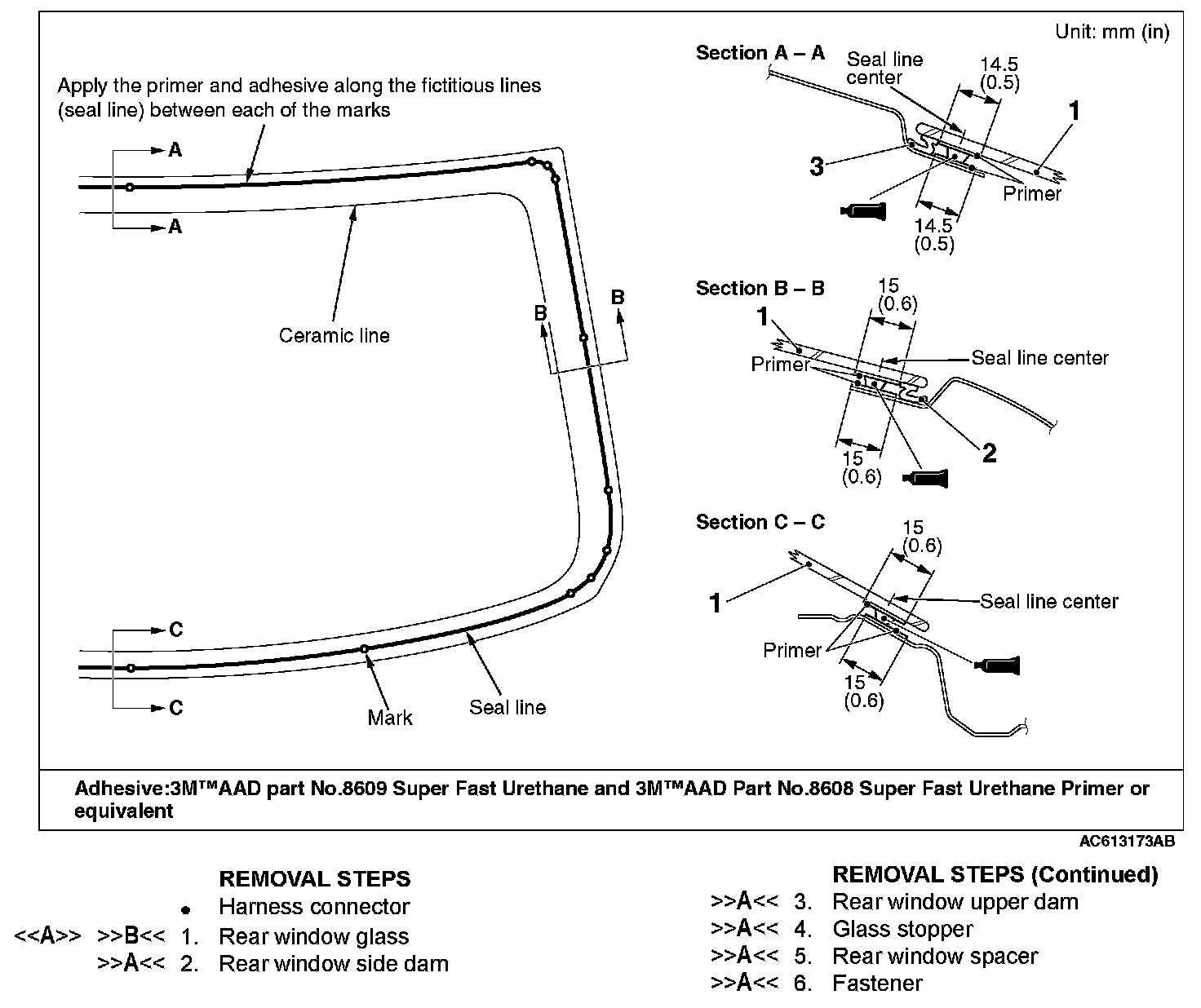 ]]A[[ FASTENER/REAR WINDOW SPACER/GLASS STOPPER/REAR WINDOW UPPER DAM/REAR WINDOW SIDE DAM INSTALLATION