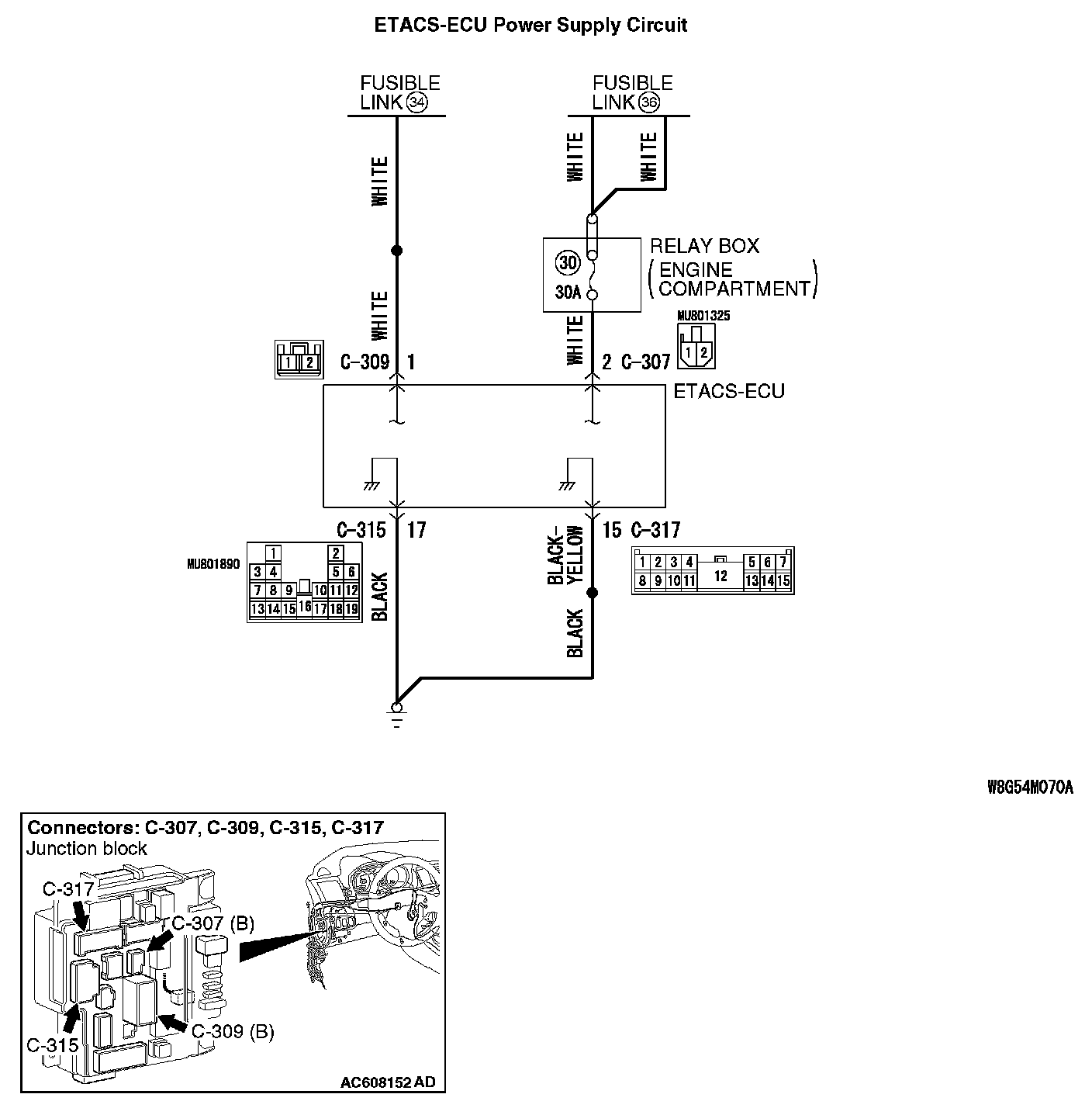 STEP 6. Check the wiring harness between ETACS-ECU connectors C-307 (terminal 2) or C-309 (terminal 1) and the fusible link (36) or (34).