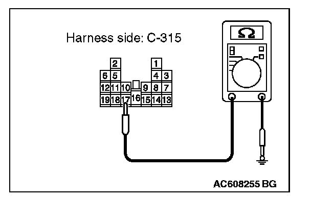 2. Measure the resistance value between ETACS-ECU connector C-315 terminal 17 and ground.