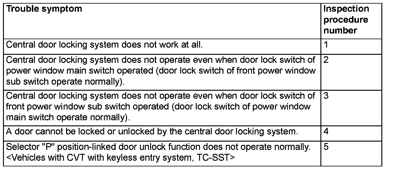 TROUBLE SYMPTOM CHARTCAUTION: During diagnosis, a diagnostic trouble code associated with other system may be set when the ignition switch is turned on with connector(s) disconnected. On completion, check all systems for diagnostic trouble code(s). If diagnostic trouble code(s) are set, erase them all.