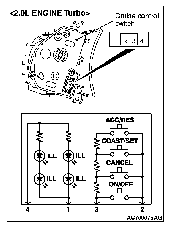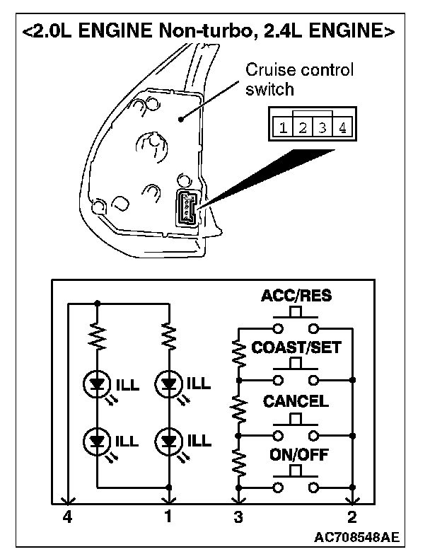 3. Check for continuity between the between terminal number 1 and terminal number 4 of the cruise control switch.