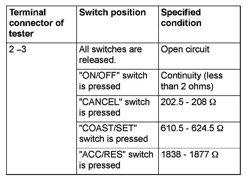 2. Measure the resistance between terminal number 2 and terminal number 3 when each of the "ON/OFF", "CANCEL", "COAST/SET" and "ACC/RES" switches is pressed. If the values measured at the time each switch is pressed correspond to those in the table below, the resistance values are correct.