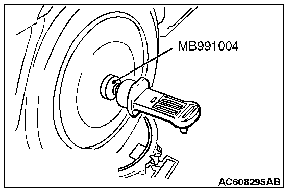 NOTE: For vehicles with aluminum type wheels, attach the camber/caster/kingpin gauge to the driveshaft by using the special tool MB991004. Tighten the special tool MB991004 to the same torque 144 - 176 Nm (106 - 130 ft-lb) as the driveshaft nut.