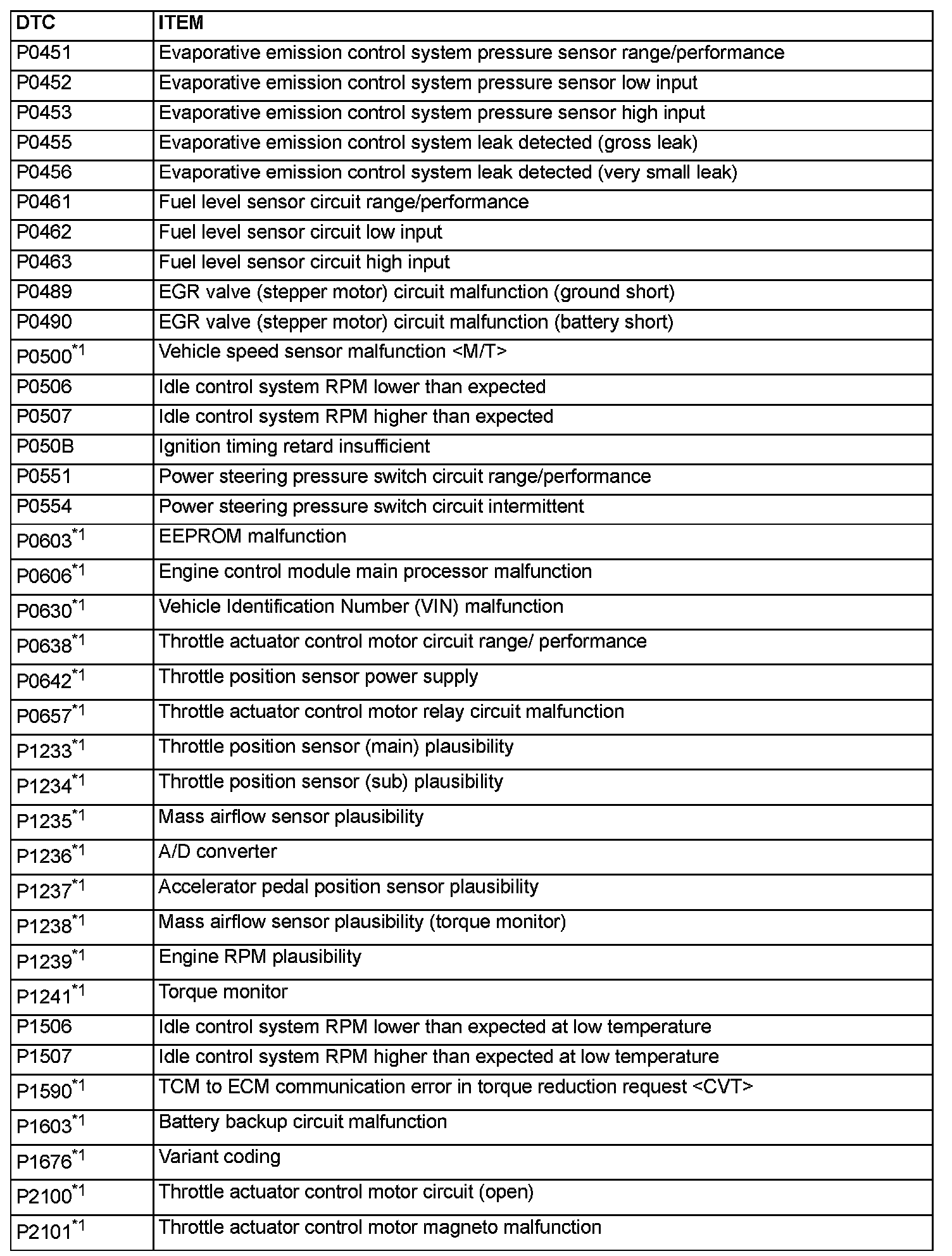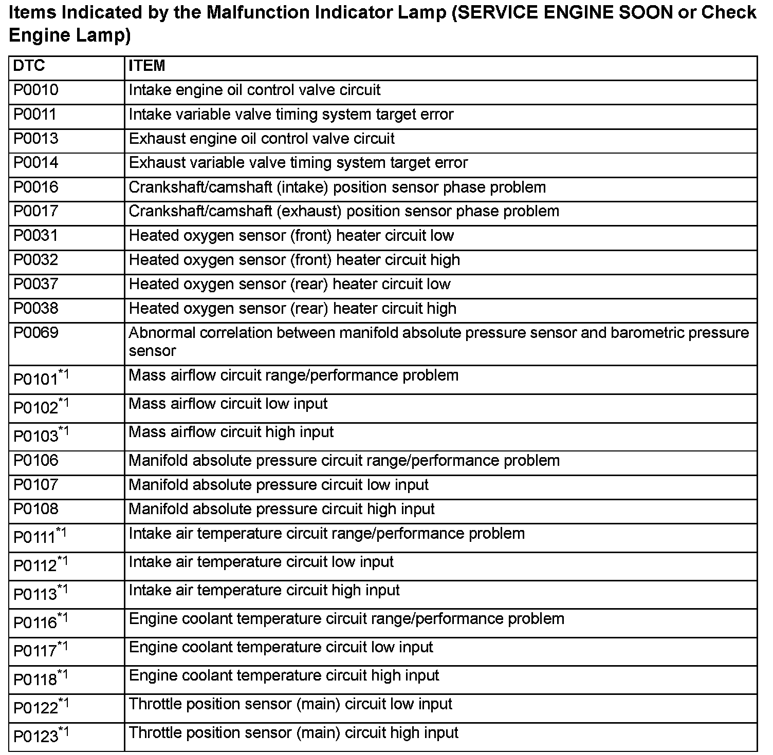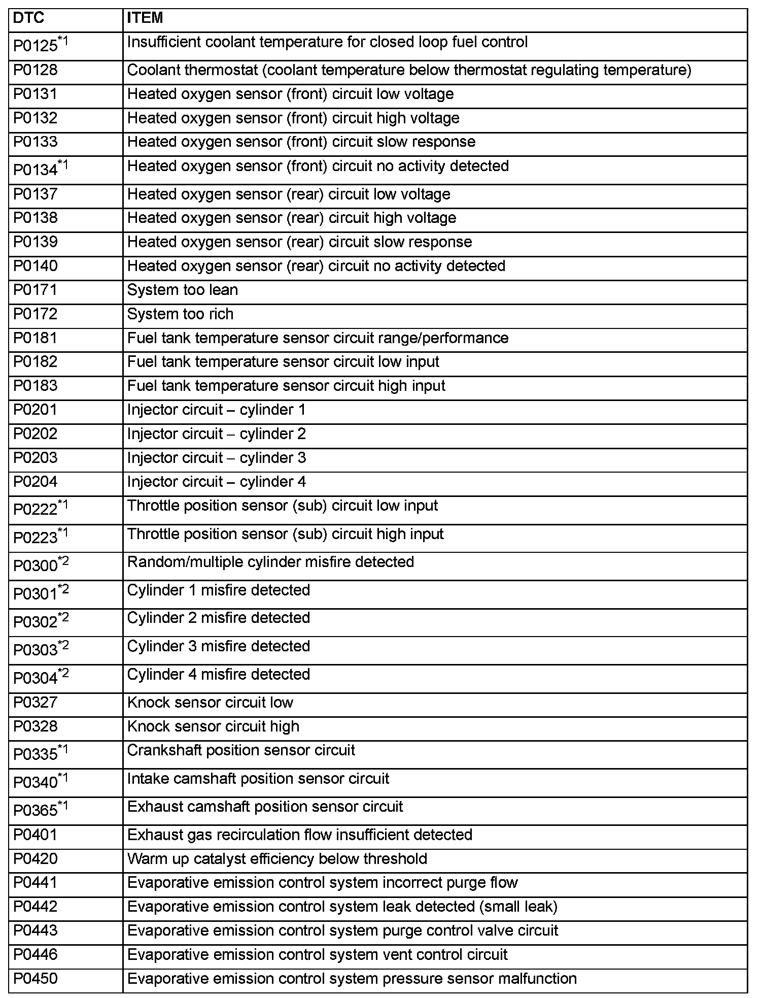 - The codes marked with a "*2" in the diagnosis code number column have the following two conditions for illuminating the Malfunction Indicator Lamp (SERVICE ENGINE SOON or Check Engine Lamp).