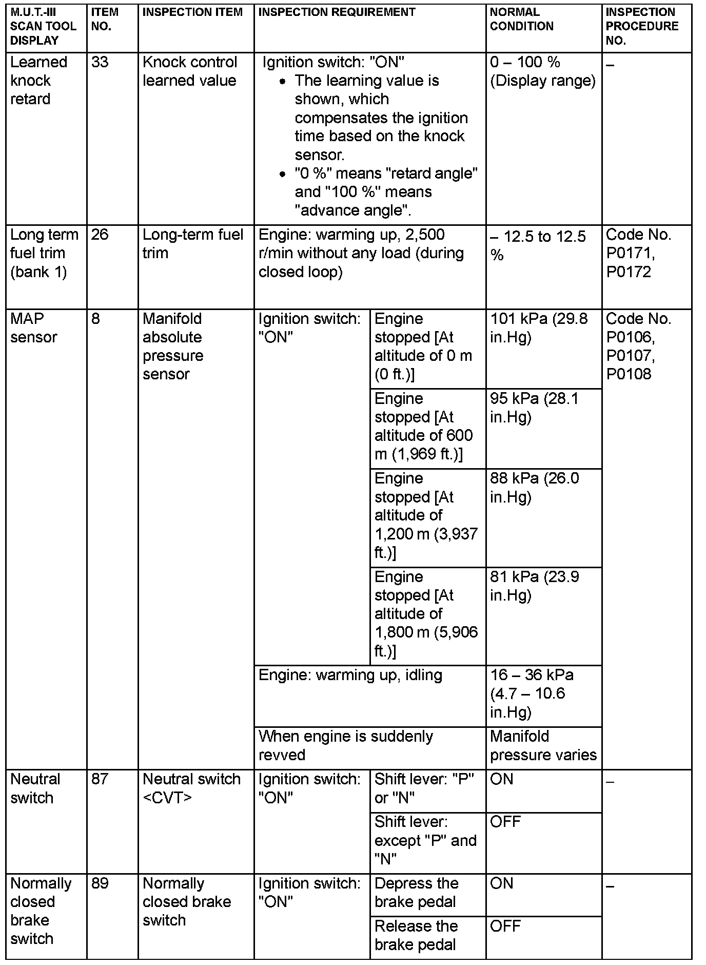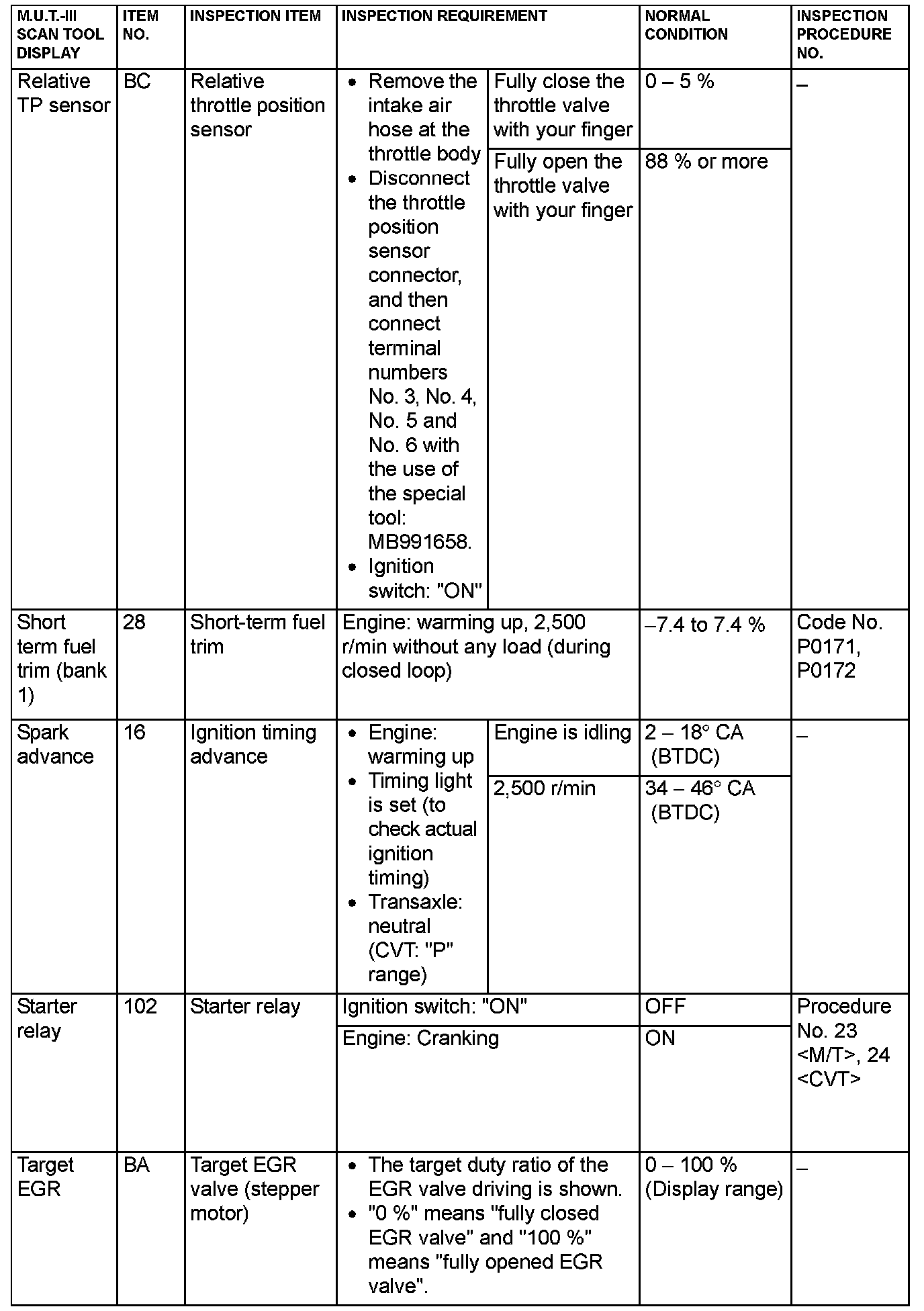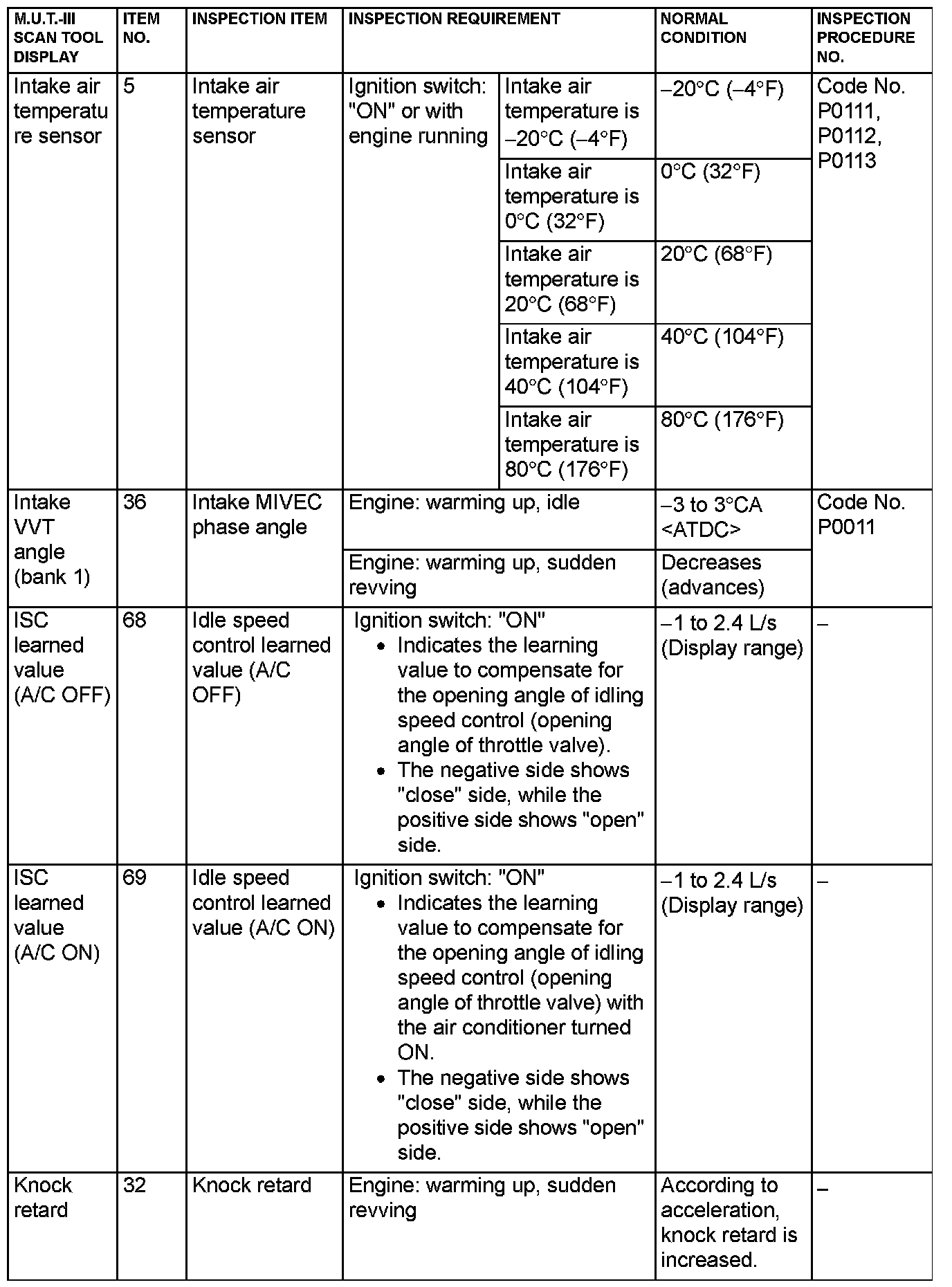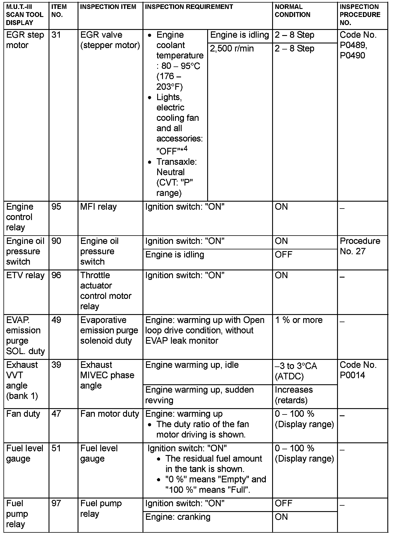 - 5*: Data items are displayed on M.U.T.-III display, but the in-line 4 engine is not applicable and its data is displayed as "N/A".