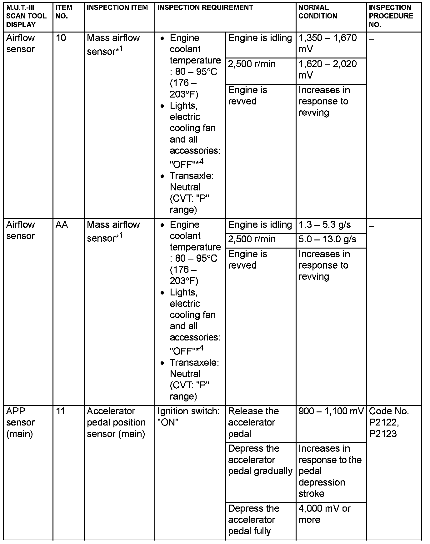 - 1*: In a new vehicle [driven approximately 500 km (311 mile) or less], the mass airflow sensor output value is sometimes 10% higher than the standard value.
