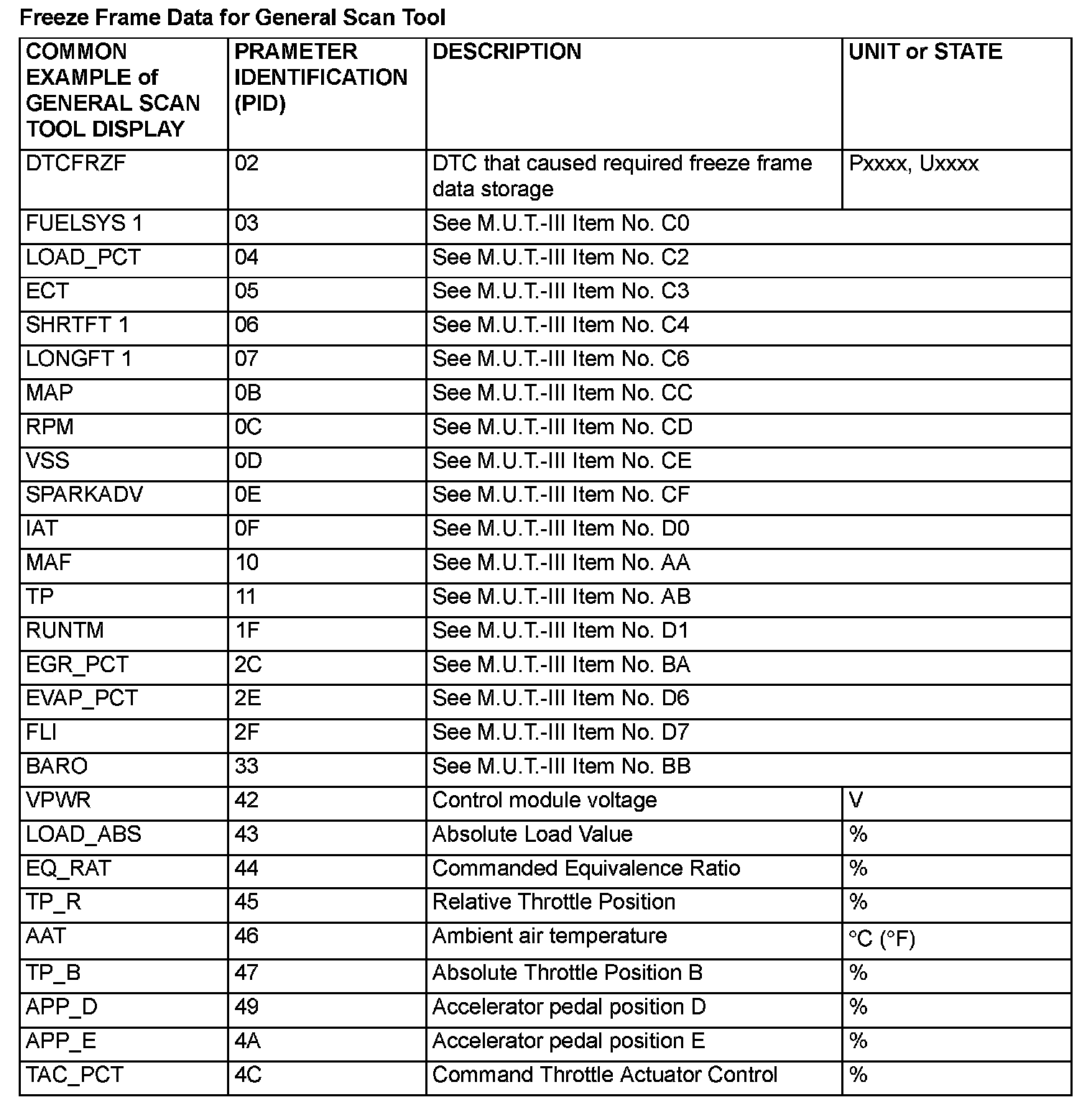Freeze Frame Data For General Scan Tool: