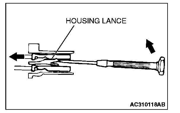 2. Insert the tip of the screwdriver [1.4 mm (0.06 inch) or 2.0 mm (0.08 inch) width] into the connector as shown in the figure, raise the housing lance slightly with the tip, and pull out the terminal.