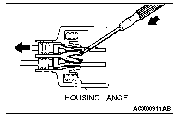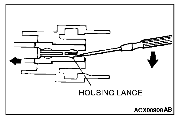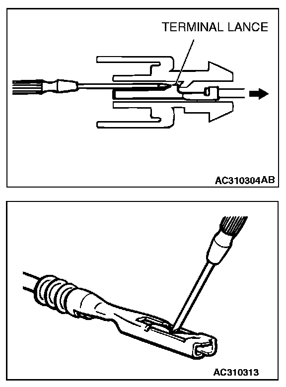CONNECTOR TERMINAL ENGAGEMENT AND DISENGAGEMENTLoosely engaged terminals can be repaired by removing the female terminal from the connector housing and raising its lance to establish better engagement. Removal of the connector terminal used for MFI and INVECS-II A/T control circuit can be done in the following manner.