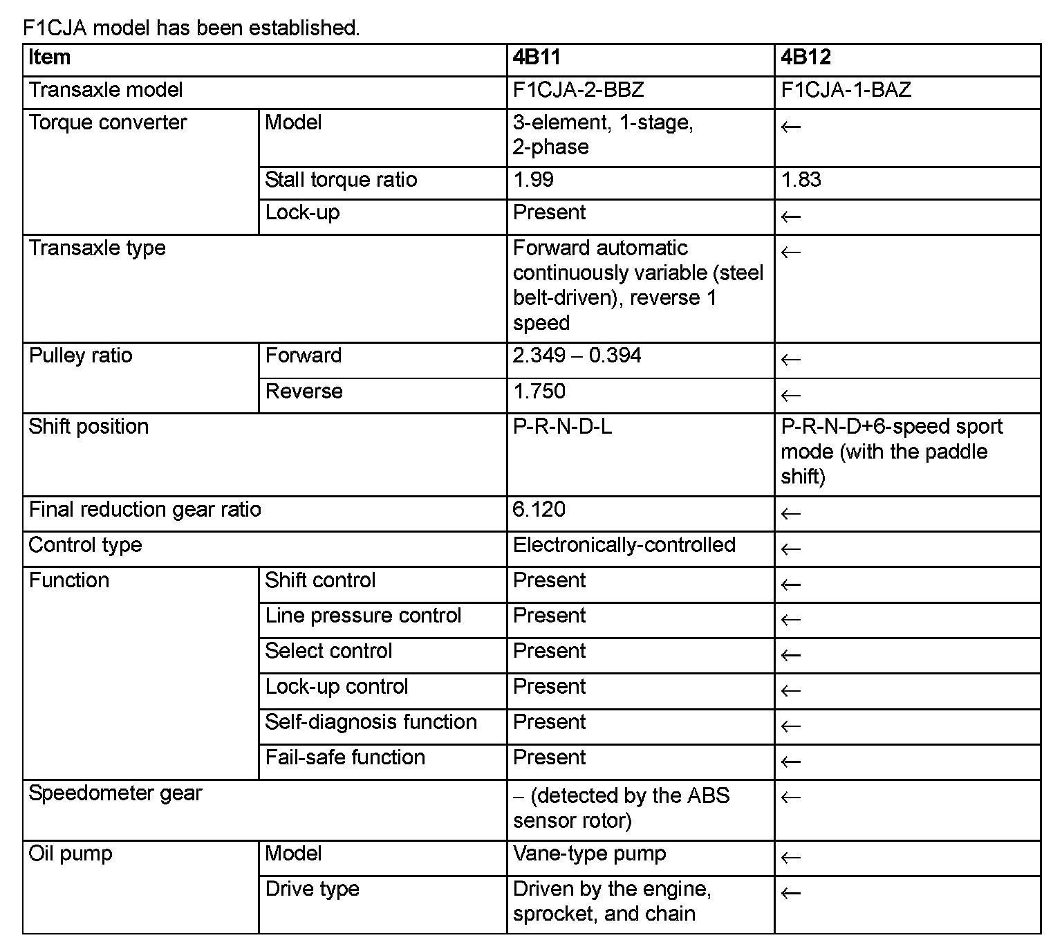 The transaxle consists of the torque converter and gear train. The three element, one-stage, two-phase type torque converter with a built-in torque converter clutch has been adopted. The gear train of F1CJA transaxle consists of 1 set of multi-disc type clutches, 1 set of multidisc type brakes, and 1 set of planetary gears which are composed of a sun gear, carrier, annulus gear, 2 sets of pulleys and 1 set of steel belts.