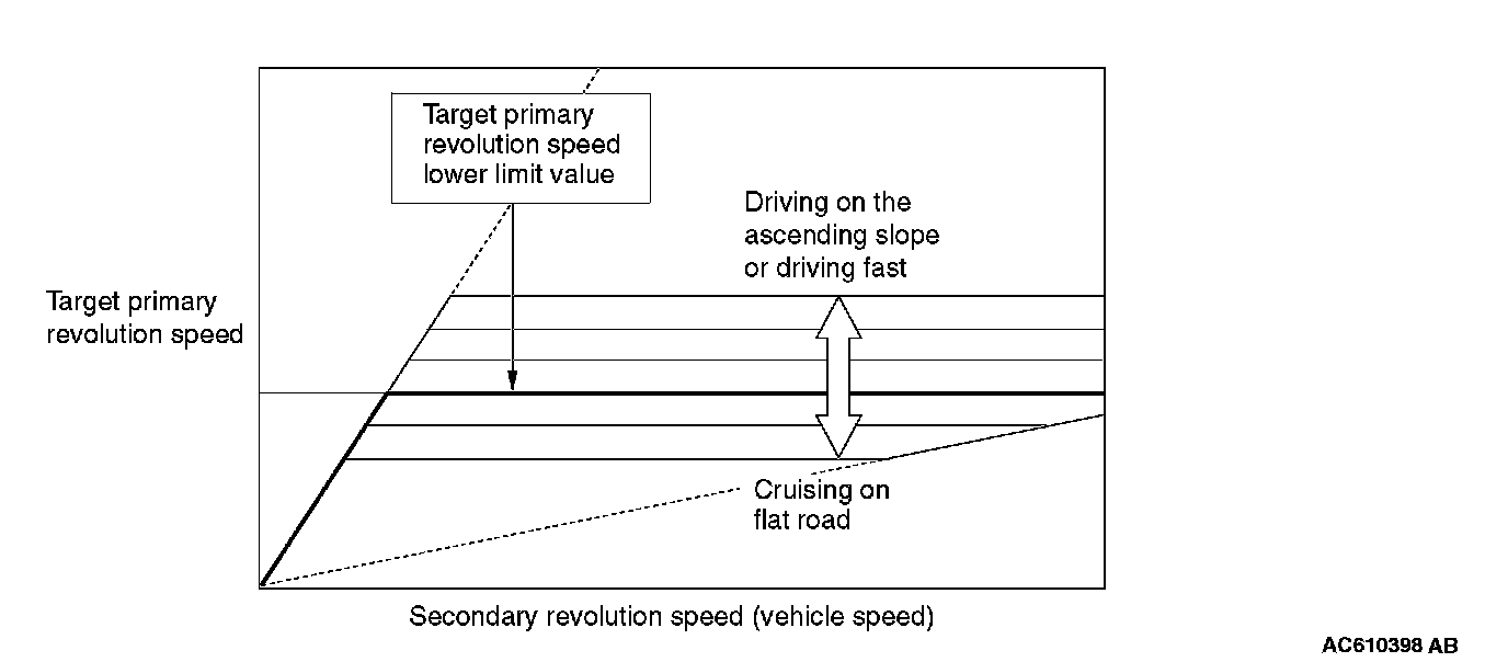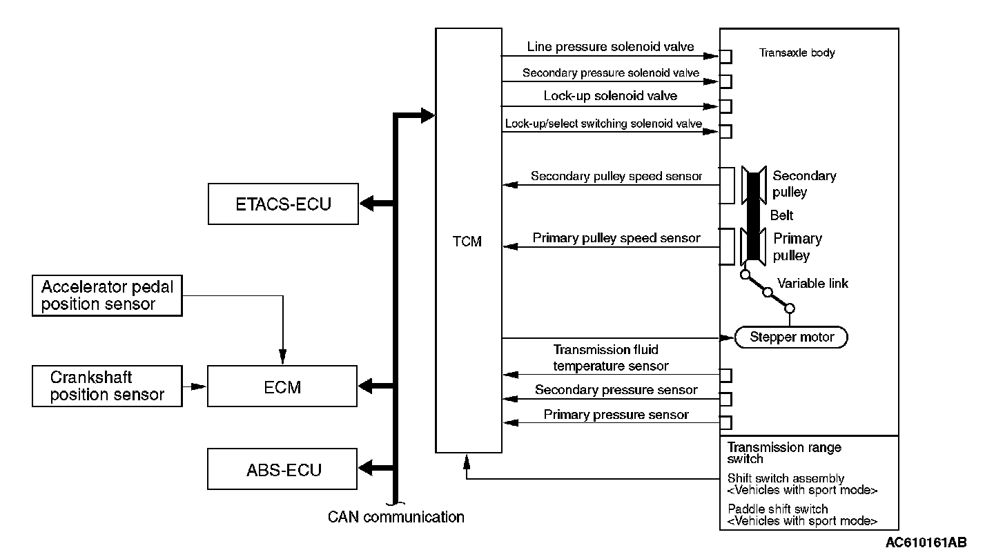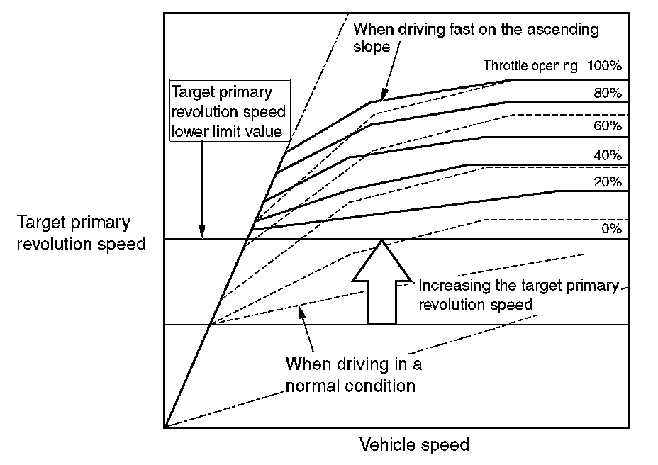 To select the pulley ratio which can provide the driving force corresponding to the driver's intention and vehicle conditions, TCM selects the optimal pulley ratio and determines the shift strategy to obtain it by detecting the vehicle driving conditions such as the vehicle speed, accelerator angle. Then, it outputs the command to the stepper motor, controls in/out flow of the line pressure to/from the primary pulley, positions the movable pulley of the primary pulley, and controls the gear ratio.