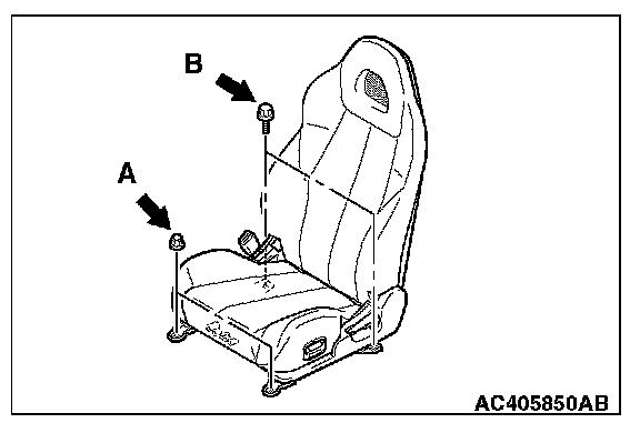 1. Temporarily tighten the nuts in mounting locations shown in the illustration with no weight on the front seat cushion and check the operation of the seat slide.