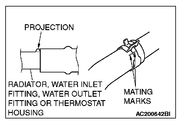 1. Insert each hose as far as the projection of the radiator, water inlet fitting, water outlet fitting or thermostat housing.