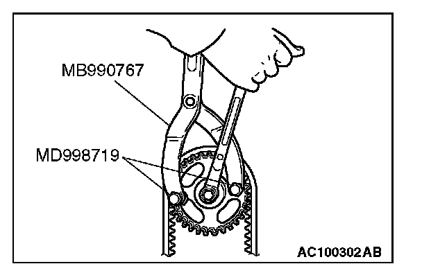 1. Hold the camshaft sprocket with special tools MB990767 and MD998719 in the same manner as removal.