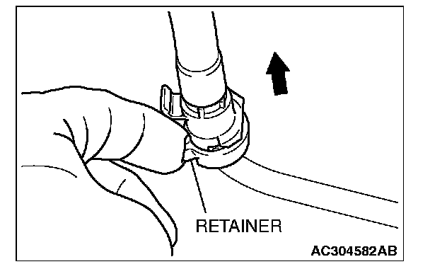 2. Pull up the retainer and remove the fuel high-pressure hose in the direction shown.