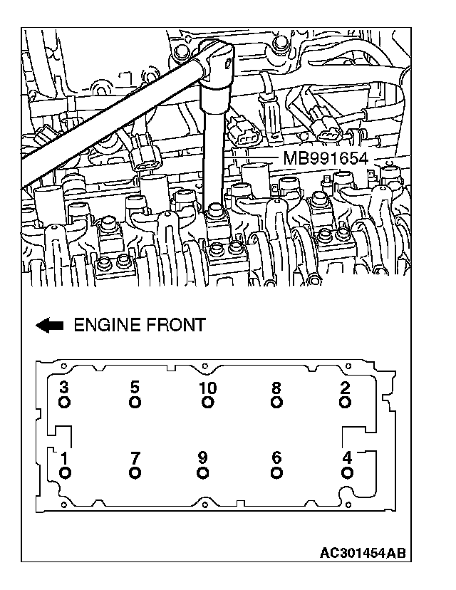 3. Use special tool MB991654 to tighten the cylinder head bolts in the following procedures.