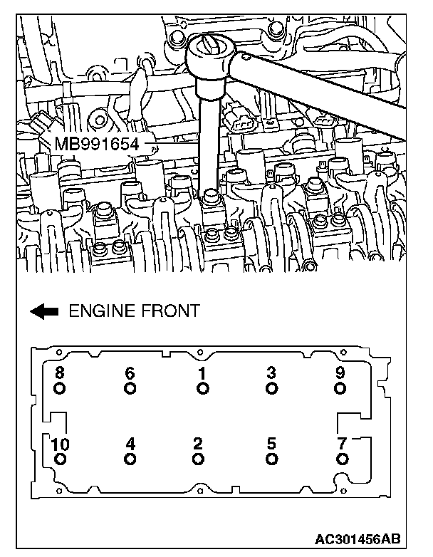 Use special tool MB991654 to loosen the cylinder head bolts in two or three steps in the order shown in the illustration. If the cylinder head bolts cannot be pulled out due to the washer being trapped in the valve spring, raise the bolt slightly, then remove it while holding it with a magnet.