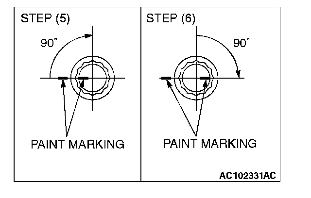 5) Apply a paint mark to the heads of the cylinder head bolts and cylinder head, then tighten 90° as shown.