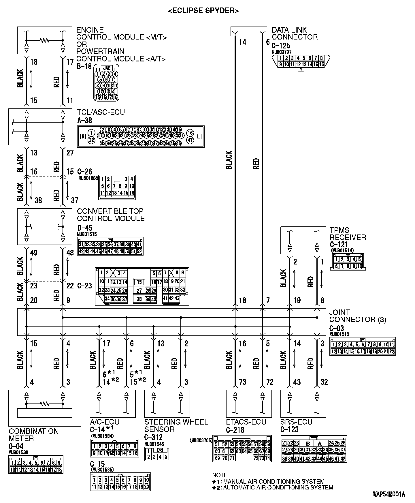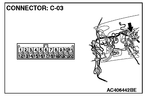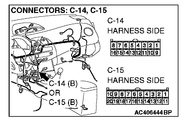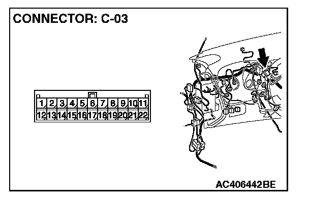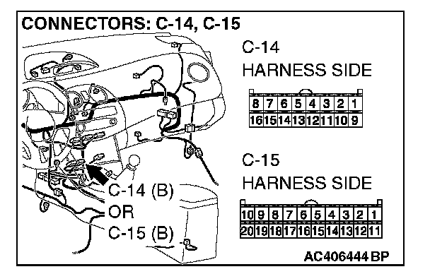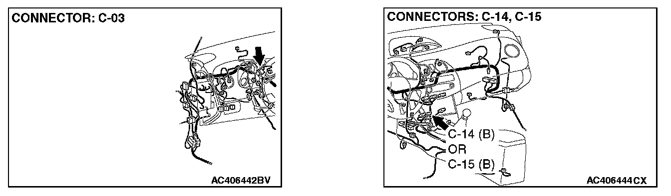 STEP 1. Check joint connector (3) C-03 and A/C-ECU connector C-14 [manual air conditioning system] or C-15 [automatic air conditioning system] for loose, corroded or damaged terminals, or terminals pushed back in the connector.