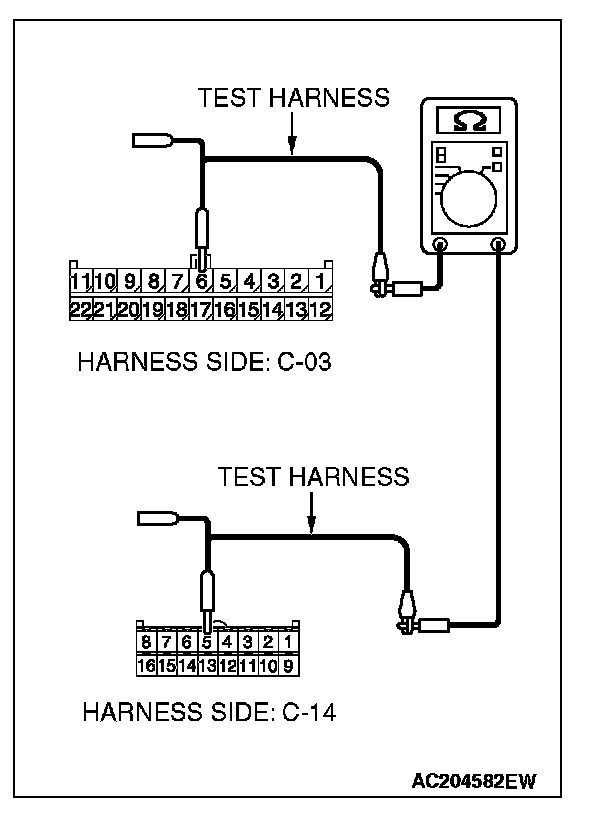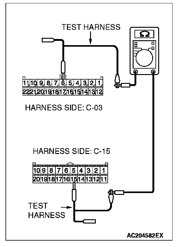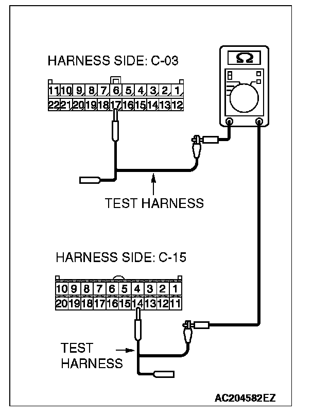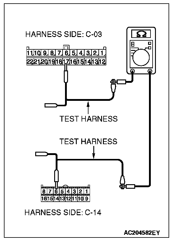 STEP 2. Check the CAN bus lines between joint connector (3) C-03 and the A/C-ECU. Measure the resistance between joint connector (3) C-03 and A/C-ECU connector C-14 [manual air conditioning system] or C-15 [automatic air conditioning system].