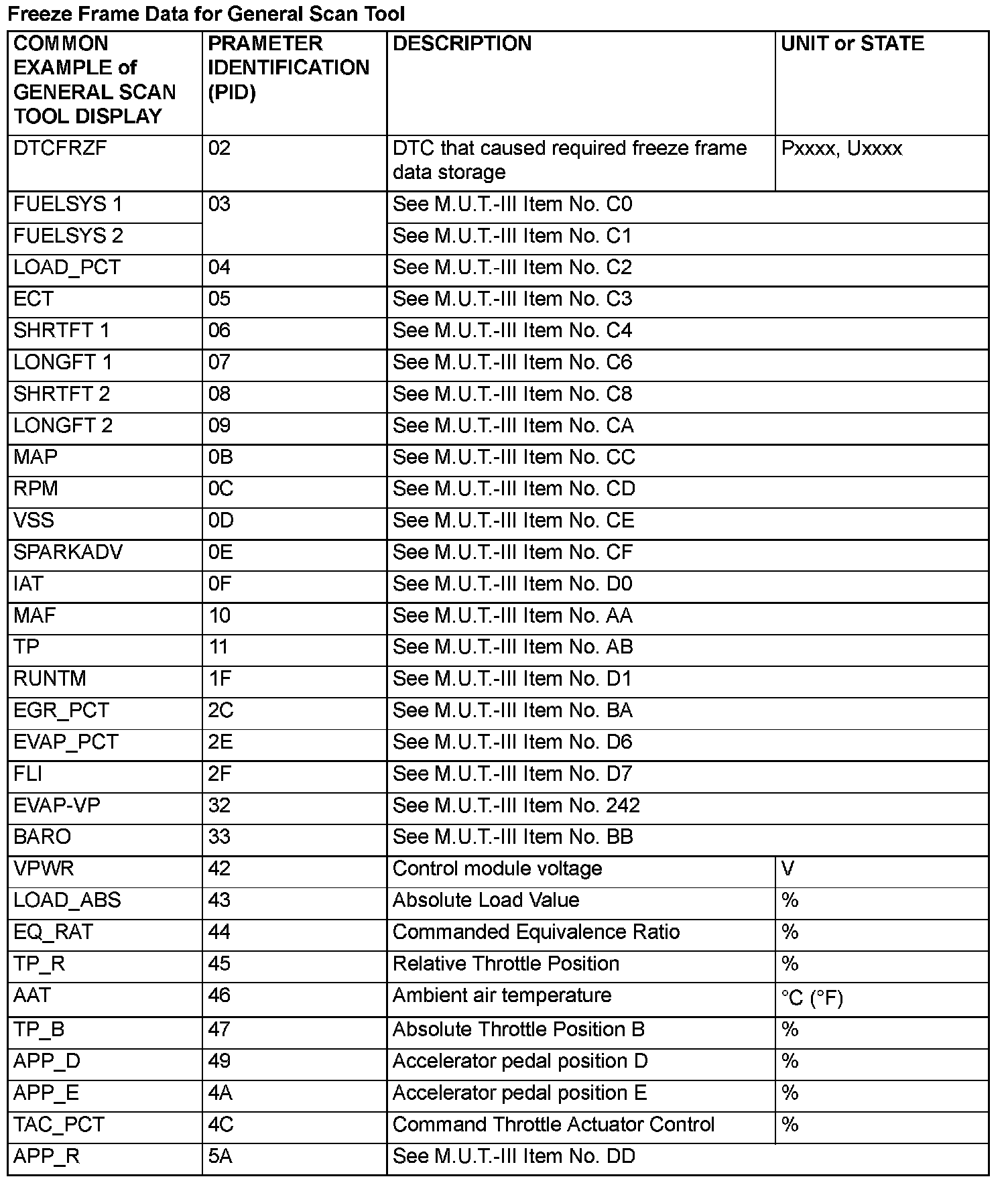 Freeze Frame Data for General Scan Tool: