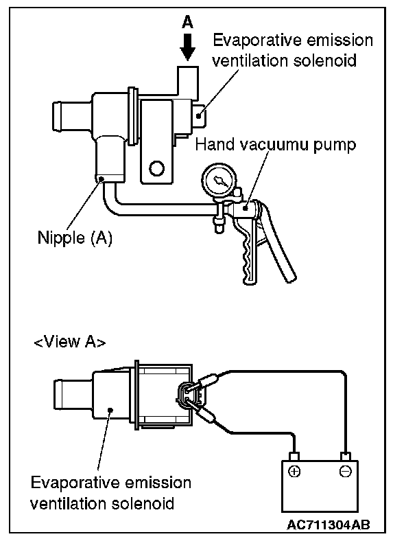 1. Connect a hand vacuum pump to nipple (A) of the evaporative emission ventilation solenoid.