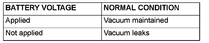 2. Check air tightness by applying a vacuum with voltage applied directly from the battery to the evaporative emission ventilation solenoid and without applying voltage.