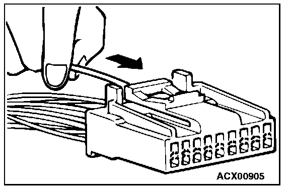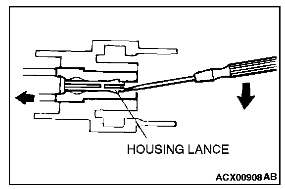 2. Insert the tip of a screwdriver [0.8 mm (0.03 inch) width] into the connector as shown in the figure, push it lightly to raise the housing lance, and pull out the terminal.