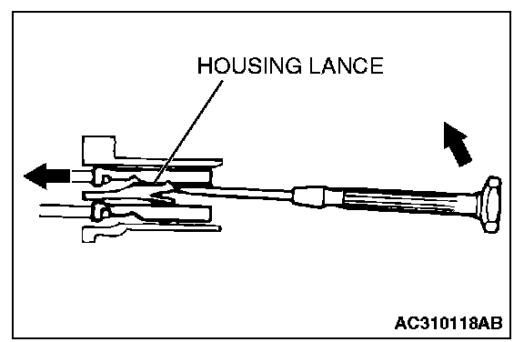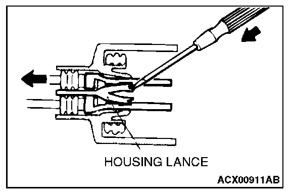 CONNECTOR TERMINAL ENGAGEMENT AND DISENGAGEMENTLoosely engaged terminals can be repaired by removing the female terminal from the connector housing and raising its lance to establish better engagement. Removal of the connector terminal used for MFI and INVECS-II A/T control circuit can be done in the following manner.