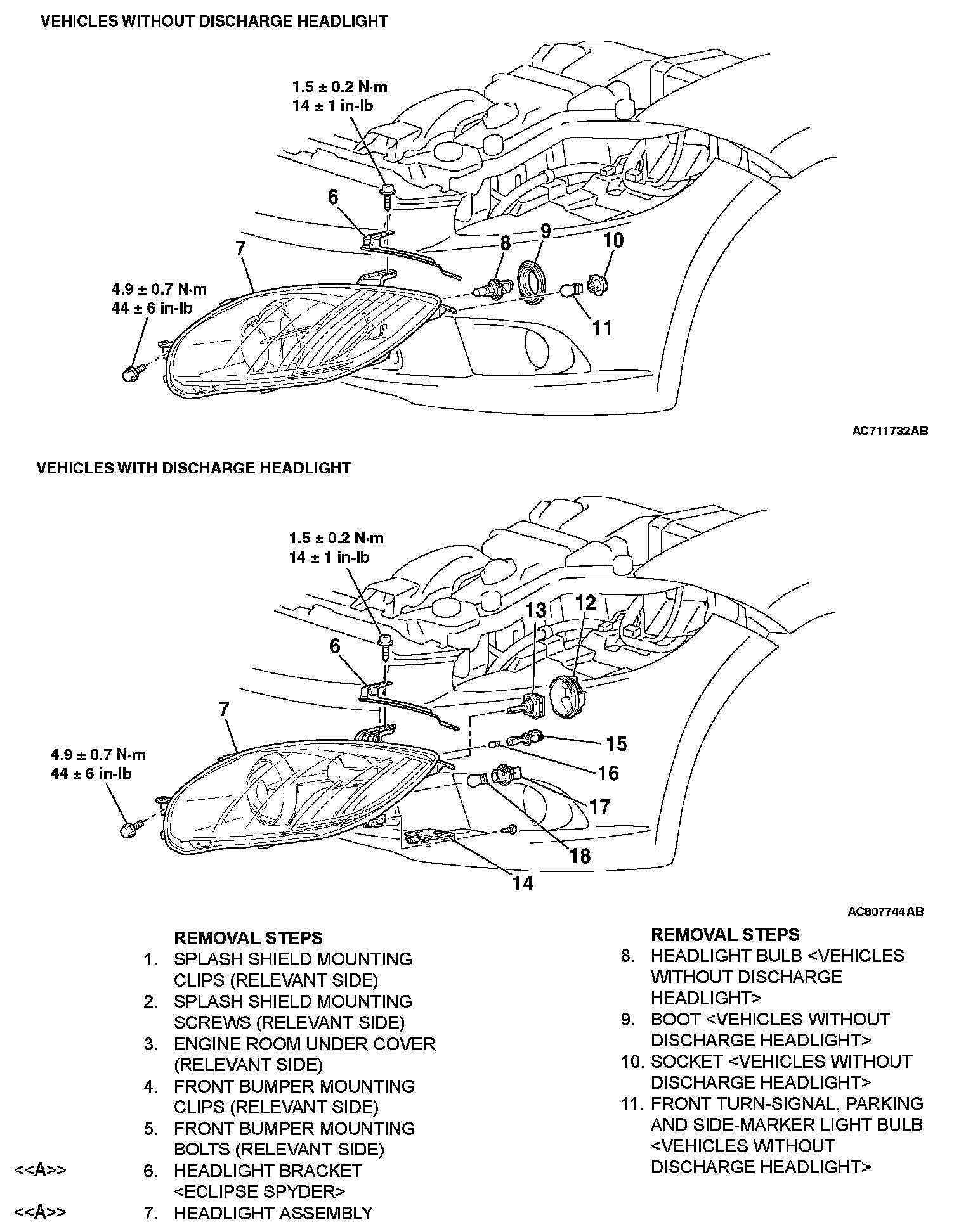 Remove the headlight bracket [ECLIPSE SPYDER] and the headlight assembly with the applicable side of the front bumper slid downward slightly.