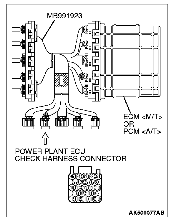 1. Disconnect all ECM [M/T] connectors or PCM [A/T] connectors. Connect the check harness special tool (MB991923) between the separated connectors.