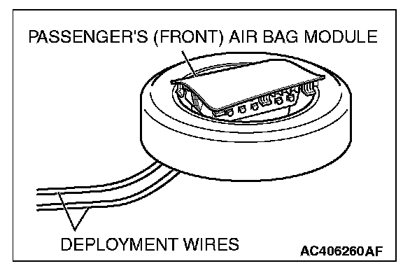 CAUTION: Once disconnected, both electrodes of the passenger's (front) air bag module connector short automatically to prevent accidental deployment caused by static etc. Still, in consideration of possible accidental deployment, store the air bag module on flat place with deployment surface facing up. Do not put anything on it.