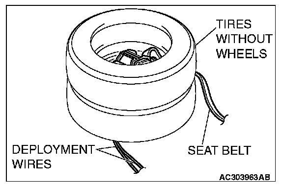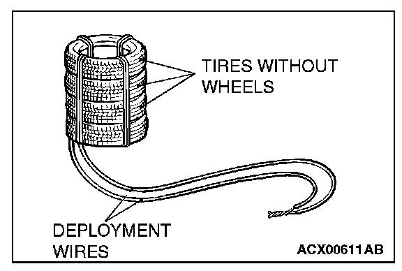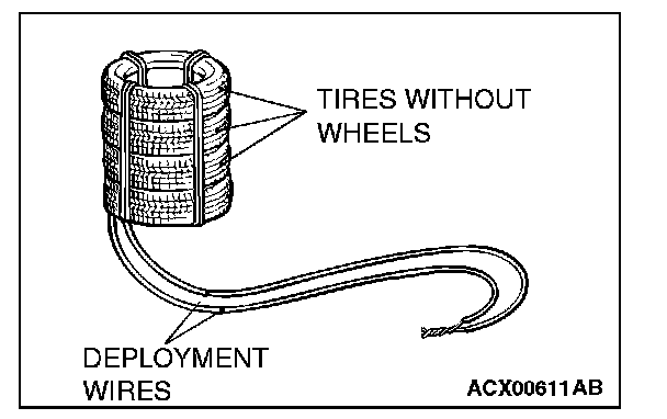 6. Place three old tires without wheels on top of the tire secured to the air bag module, and secure all tires together with ropes (four locations).