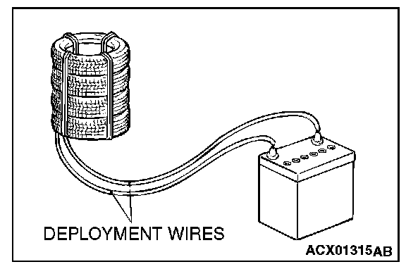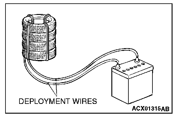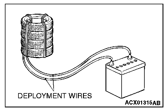 10. At a location as far away from the air bag module as possible, and from a shielded position, disconnect the two connected wires from each other, and connect them to the two terminals of the battery (which has been removed from the vehicle) to deploy the air bag.