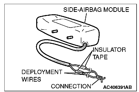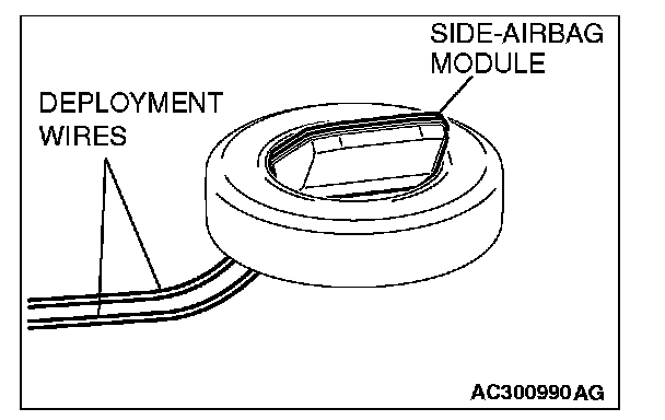 CAUTION: Once disconnected, both electrodes of the side-airbag module connector short automatically to prevent accidental deployment caused by static etc. Still, in consideration of the accidental deployment, store the air bag module on flat place with deployment surface facing up. Also, do not put anything on it.