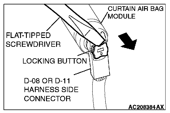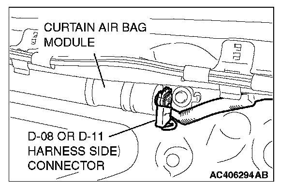 3. Disconnect harness side connector D-08 or D-11 (two-pin, black) from the curtain air bag module.