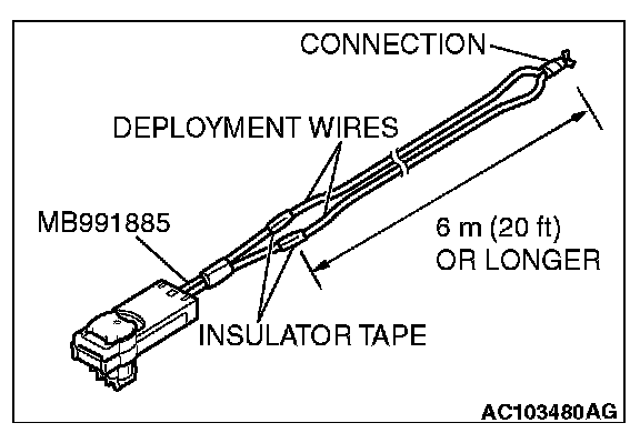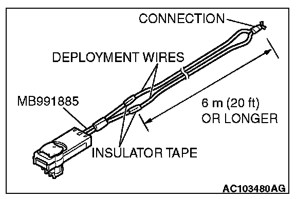 5. Connect deployment wires, each 6 meters (20 feet) or longer, to the two leads of special tool adapter harness (MB991885), and cover the connections with insulator tape. The other ends of the deployment wires should be connected to each other (short-circuited), to prevent sudden unexpected deployment of the air bag module.