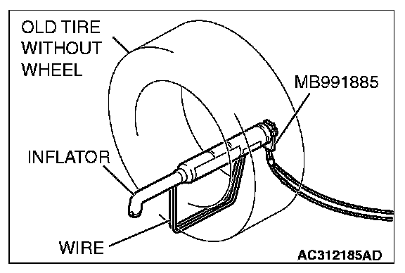 5. Pass the thick wire through the air bag module mounting hole, and then secure the air bag module to an old tire with a wheel in it so that the pad on the module is facing upwards.